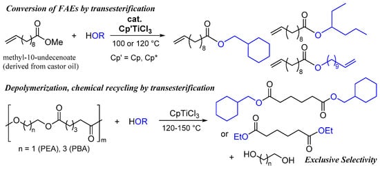 - Nomura, K.; Aoki, T.; Ohki, Y.; Kikkawa, S.; Yamazoe, S. Transesterification of methyl-10-undecenoate and poly(ethylene adipate) catalyzed by (cyclopentadienyl)titanium trichlorides as model chemical conversions of plant oils and acid-, base-free chemical recycling of aliphatic polyesters. ACS Sustain. Chem. Eng. 2022, 10, 12504–12509. [Google Scholar] [CrossRef]