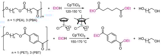 In this paper, we present more results regarding the Cp’TiCl3 catalyzed transesterification (depolymerization) of PEA, PBA with ethanol and the results of that method applied to depolymerization of PET (one of the commodity polyesters, pellet and sheet by cutting the drink bottle) and PBT with ethanol (Scheme 2). The efforts should introduce the utilization of this simple (acid-base-free) catalytic chemical recycling of polyesters through simply mixing polymers and alcohols upon heating to convert monomers with exclusive selectivity []. Moreover, a possibility of one-pot re-preparation of polyester (PBA), closed-loop one-pot chemical recycling, has been demonstrated by subsequent condensation polymerization by removing ethanol in vacuo [].