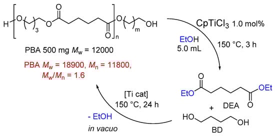 The resultant reaction mixture after the transesterification of PBA with ethanol should remain titanium alkoxide species derived from CpTiCl3 []; the mixture consisting of DEA and BD was heated in vacuo to proceed with the condensation polymerization with the removal of ethanol accompanied at 150 °C (Scheme 3). Certain titanium alkoxides, like Ti(OiPr)4, were used for condensation polymerization of the synthesis of polyesters []. After the reaction, the resultant highly viscous liquid (solid) was washed with methanol to collect as the white precipitates. The resultant PBA possessed high molecular weight with unimodal molecular weight distribution (Mn = 11,800, Mw/Mn = 1.6). The result demonstrates a possibility of the one-pot closed-loop chemical recycling (one-pot depolymerization and re-condensation polymerization) in the presence of titanium catalyst and ethanol.