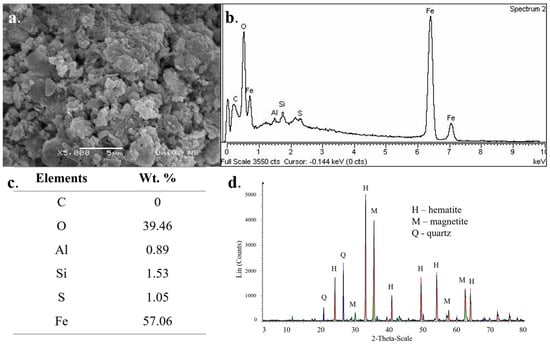 The SEM image (Figure 1a) indicated that the PC sample represented non-uniformly shaped particles with rough and granular textures and large amounts of open porosity. Regarding their size, the particles differed, ranging from 0.1–2.5 μm, similar to natural pyrite [4]. The energy dispersive X-ray spectrum of the elements confirmed the presence of Fe and O (Figure 1b,c). These characteristics may have influenced the availability of the superficial iron for the catalysis of the heterogeneous Fenton process [43]. The XRD patterns proved that the primary diffraction peaks belonged to hematite, magnetite, and quartz (Figure 1d).