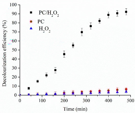 The results showed that there was no obvious oxidation of the dye by the H2O2 without the PC as the decolorization efficiency after 480 min was 3.8%. The potential losses due to the RR120 molecule adsorption on the PC surface were also negligible (no more than 6.6% after 8 h). Approximately 92.3% of the RR120 was degraded in the PC/H2O2 within the same time. Thus, the results revealed that the enhanced removal of the RR120 was attributed to the heterogeneous Fenton-like process.