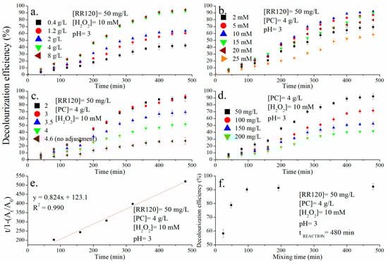 Optimization of the RR120 solution decolorization. (a) Effect of PC dosage. (b) Effect of H2O2 concentration. (c) Effect of initial solution pH. (d) Effect of initial dye concentration. (e) Kinetics. (f) Required mixing time.