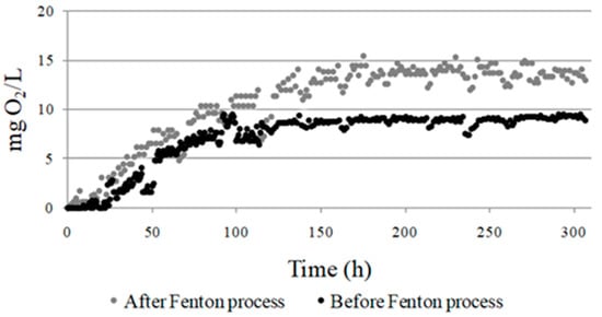 Respirometry tests are a widely employed method for the characterization of wastewater streams to access toxic/inhibitory effects towards a biomass. The detailed characterization of such streams is fundamental for efficient operations in wastewater treatment units. Determination of the respirometry activities of industrial pollutants towards biological activated sludge is a useful and convenient parameter for the assessment and control of acute toxicity and microbial inhibition [63,64,65,66]. In this research, respirometry measurements were conducted to investigate the comparisons of the biodegradability and toxicity of the tested effluent before and after the Fenton process was applied. The results, presented in Figure 4, indicated that there was an increase in oxygen consumption after the applied heterogeneous Fenton process. The increased oxygen consumption indicated the higher biodegradability of the compounds in the treated effluent, as well as the absence of toxic effects of the resulting oxidation intermediates towards the microorganisms that carry out biodegradation. This effect was particularly pronounced in the initial phase of the process, where for the untreated effluents, the inhibition of the microorganisms phenomena was observed.
