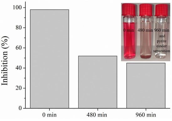 Bioluminescence tests were performed in a mixture at the beginning of the process (time zero) when the optimal operating conditions were used (pH of 3, 10 mM of H2O2, 4 g/L of PC, and 50 mg/L of RR120), and they promoted an inhibition rate of 98% (Figure 5). After 480 min, the pH increased to a neutral level, and residue separation and inhibition decreased to 52%. Luminescence was measured again in the reaction mixture after an additional 8 h, when the detected inhibition was 45%. Very high toxicity in the beginning of a process is a reflection of a high dye concentration, the presence of hydrogen-peroxide, and possible metal leaching from PC. After 480 min, the inhibition originated from the formed dye molecule intermediates. As the reaction proceeded, there was a complete exhaustion of H2O2 and the concentration of the intermediate aromatics products decreased, resulting in the detoxification of the treated solution. Similar results have been reported in the literature [2,9,70,71].
