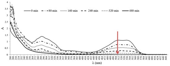 To study the degradation of the RR120 with PC in a Fenton-like process, UV-Vis spectral changes in the aqueous solution as a function of the reaction time were recorded (Figure 6).The UV-VIS absorption spectrum of the RR120 showed two absorption peaks: one in the UV region (λmax = 290 nm) and another doublet peak in the visible region (λmax = 512–540 nm). The UV band was characteristic of the p-conjugated naphthalene ring, whereas the strong doublet absorption bands in the visible region appeared due to its conjugation through the hydrazone unit [62]. The doublet peaks at 512 and 540 nm decreased as the reaction proceeded, and they eventually disappeared, indicating that the azo link had been broken down. The peaks in the UV region (290, 245, and 210 nm) were largely attributed to naphthalene, the benzene ring, and other aromatics structures [2]. These absorption peaks also decreased in later phases of the reaction, indicating total dye molecule destruction.