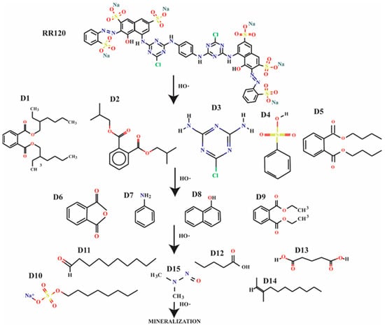 Qualitative GC/MS analysis was used to identify the primary compounds and intermediates formed during the degradation process. The obtained compounds in the effluent after treatment, as well as in sample containing only PC and H2O2 in optimal dosages, were recognized as having a probability of higher than 70%, and they are presented in Table 4. The proposed degradation pathway for the RR120 by Fenton oxidation is shown in Figure 7. In general, HO• radicals may react by the abstraction of hydrogen atoms, in addition to unsaturated bonds or direct electron transfer reactions. In the case of azo dyes, HO• radicals participate in addition reactions that trigger the oxidation of either azo linkages or aromatic structures [9]. The proposed mechanism would consist of three phases: (1) oxidative transformation of the azo groups, leading to immediate visual decolorization where the azo group was converted into amino and nitroso groups, finally leading to the formation of amino benzene (D7) and N-nitrosodimethylamine (D15), and at the end, to deamination; (2) the cleavage of the C-N bonds, forming the molecule 6-chloro-n-ethyl-n’-(propan-2-yl)-1,3,5-triazine-2,4-diamine hydrochloride (D3), as well as derivates with conjugated benzene and naphthalene rings, such as Bis(2-ethylhexyl) phthalate (D1), 1,2-Benzenedicarboxylic acid, bis (2-methylpropyl) ester (D2), Benzene sulphonic acid (D4), and Dibutyl phthalate (D5), and the obtained molecules undergo further mineralization, creating simpler products such as phthalic anhydride (D6), naphtalen-1-ol (D8), and diethyl phthalate (D9); and (3) ring opening reactions, forming intermediates such as sodium octyl sulphate (D10), decana, (D11), pentanoic acid (D12), pentanedioic acid (D13), and 2-Undecene, 5-methyl- (D14). The results confirmed that the decomposition of the dye molecules followed the direction of creating a simpler aromatic and aliphatic intermediates and products formed by “opening” the aromatic rings, leading to the end oxidation products, CO2, H2O, and inorganic compounds, which is in accordance with the literature data [2,16,50,72,73]. However, complete mineralization to CO2 and H2O was not possible, which is in accordance with the TOC results.