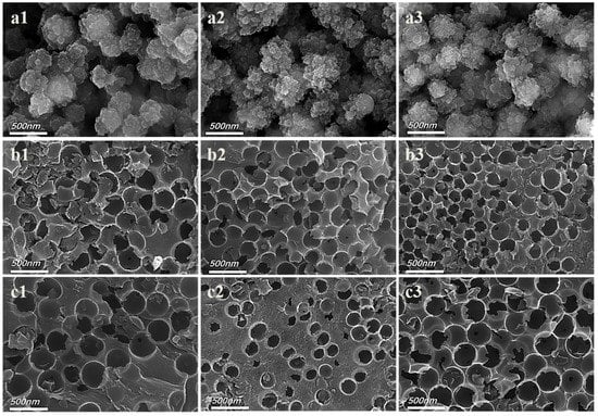 SEM images of SiO2@NxP (a1–a3), BNxC (b1–b3), and N-BNxC (c1–c3) (x = 1, 2, 3, corresponding to MBA:AM = 1:1, 1:2, 1:3, respectively).