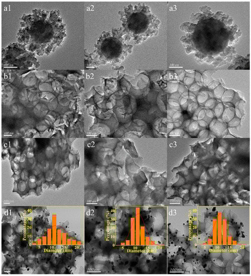 TEM images of SiO2@Polyx (a1–a3), BNxC (b1–b3), N-BNxC (c1–c3), and Au1Pd1/N-BNxC (d1–d3) nanocatalysts (x = 1, 2, 3, corresponding to MBA:AM = 1:1, 1:2, 1:3, respectively).