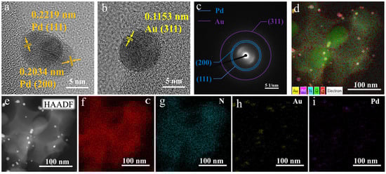 Furthermore, the components of the representative Au1Pd1/N-BN2C nanocatalyst were characterized by HR-TEM, SAED, and EDS. HR-TEM images (Figure 3a,b) of Au1Pd1/N-BN2C showed the crystal planes of Pd (111), Pd (200), and Au (311), which were 0.2219 nm, 0.2034 nm, and 0.1153 nm, respectively. In addition, selective electron diffraction (SAED) of the Au1Pd1/N-BN2C catalyst (Figure 3c) also showed the (111), (200), and (311) crystal faces of Au and Pd, respectively. The representative Au1Pd1/N-BN2C nanocatalyst was composed of C, N, O, Au, and Pd elements (Figure 3d). Moreover, the bimetallic nanoparticles were uniformly loaded on the support surface (Figure 3e–i).