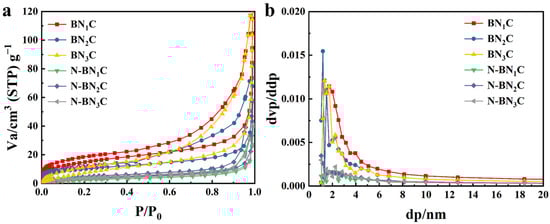 N2 adsorption–desorption isotherms (a) and pore diameter distribution (b) of BNxC and N-BNxC (x = 1, 2, 3, corresponding to MBA:AM = 1:1, 1:2, 1:3, respectively).