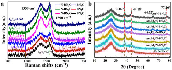 Raman spectra of BNxC and N-BNxC (a) and XRD spectra of AumPdn/N-BNxC (b) (x = 0, 1, 2, 3).