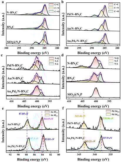 C 1s (a,b), and N 1s (c,d) XPS spectra of SiO2@N2P, BN2C, N-BN2C, Au/N-BN2C, Pd/N-BN2C, and Au1Pd1/N-BN2C. Au 4f (e) and Pd 3d (f) XPS spectra of Au/N-BN2C, Pd/N-BN2C, and Au1Pd1/N-BN2C.