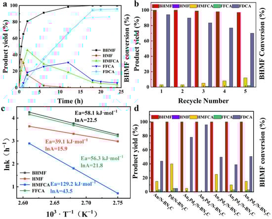 The transformation of BHMF with Au1Pd1/N-BN2C was investigated regarding reaction time. As shown in Figure 7a, the yield of FDCA reached 95.8% after 24 h reaction. There were no significant changes in the FDCA yield when the reaction time was prolonged. Therefore, the reaction time was fixed at 24 h and other reaction conditions were discussed. Finally, it was discussed how the reaction pressure, temperature, and amount of catalyst affect the yield of FDCA (Figure S5). The catalytic activity of Au1Pd1/N-BN2C was investigated in a variety of temperatures. When the reaction was carried out at 80 °C, the yield of FDCA was 30.2%. When the temperature was increased to 90 °C, the yield increased to 57.4%. The yield of FDCA approached 95.8% when the reaction temperature was gradually increased to 100 °C. Therefore, 100 °C was chosen as the reaction temperature. Additionally, the effect of oxygen pressure on the catalytic activity of the catalyst was also studied. With increasing oxygen pressure, FDCA yield increased from 40.8% (1.0 MPa) to 58.6% (1.5 MPa). The yield of FDCA increased to 95.8% when oxygen pressure was increased to 2.0 MPa. When pressure was further increased to 2.5 MPa, the production of FDCA did not change. In addition, the influence of the dosage of the catalyst on the catalytic activity of the catalyst was studied. The yield of FDCA increased from 43.8% (30 mg) to 70.6% (40 mg) with an increase in catalyst dose. The yield of FDCA improved to 95.8% when the catalyst dose was increased to 50 mg. The yield of FDCA dropped when the catalyst dose was increased to 60 mg. Therefore, the optimal conditions were 24 h treatment, 100 °C reaction temperature, 2.0 MPa oxygen pressure, and 50 mg of catalyst.