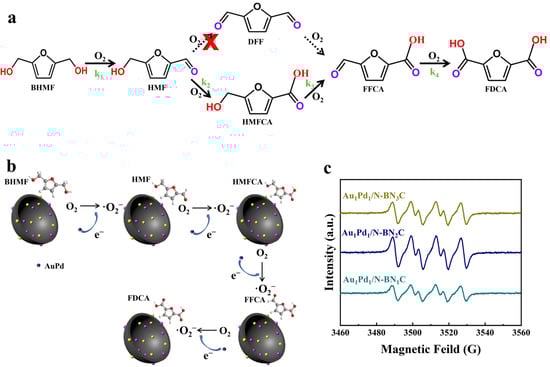 ESR spectroscopy with DMPO as the spin-trapping agent was used to further understand the active species involved in the oxidation process of the Au1Pd1/N-BN2C catalyst. As shown in Figure 8c, the characteristic peaks for DMPO-·O2− were observed, and the signal intensity of Au1Pd1/N-BN2C was the highest, which had supreme catalytic performance. It is speculated that the formation of reactive oxygen species (·O2−) further enhanced catalytic performance [15]. Combined with ESR spectroscopy and catalytic reaction, the selective oxidation mechanism of BHMF was speculated, as shown in Figure 8. The O2 absorbed at the surface active center of the catalyst was transformed to ·O2- by eliminating the electrons deposited on the Au nanoparticles. The interaction of superoxide radicals with water produces OH−, which promotes the breakage of the C–H bond in the alcohol side chain of the BHMF to yield HMF. In an alkaline environment, OH− will attack the aldehyde group of HMF, forming an alkoxide ion intermediate (geminal diol). The geminal diol intermediate was subsequently dehydrogenated to generate HMFCA, which was aided by the OH− absorbed on the surface of Au nanoparticles. Subsequently, HMFCA was converted to FFCA through the same reaction pathway as BHMF, and FFCA was eventually converted to FDCA through the same reaction pathway as HMF.