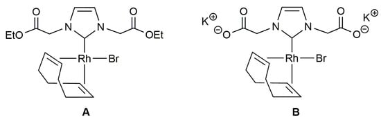 N-Heterocyclic carbenes (NHCs) offer some advantages over classical tertiary phosphines, such as higher electron donation and complex stability, which has led them to rank among the most popular ligands currently employed in homogeneous catalysis [15,16,17,18,19]. In addition, NHCs have also found application as stabilizers of metal nanoparticles (NPs), some of them featuring relevant photophysical, biomedical and catalytic properties [20,21,22,23,24]. In 1997, Herrmann and co-workers reported the preparation of the first transition-metal NHC complexes featuring water solubility, A and B in Figure 1, by introducing hydrophilic carboxylate substituents on the N-atoms of the carbene ligand [25] and, since then, research on the synthesis and applications in catalysis and biomedicine of water-soluble NHC transition metal complexes has grown considerably [26,27,28,29,30,31].