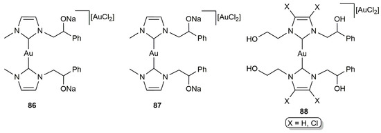 Structure of the hydrophilic bis-NHC gold(I) complexes 86–88.
