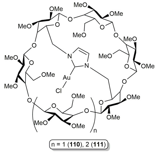 In addition to the works by Krause and co-workers, Sollogoub’s group has described a large number of NHC-containing cyclodextrins and their corresponding gold complexes [103,104,105,106,107,108,109], some of them showing catalytic potential [103,104,105,106]. In particular, relevant to the topic addressed in the present review are the water-soluble encapsulated gold(I) complexes 110 and 111, based on an NHC-capped permethylated α- and β-cyclodextrin, respectively (Figure 8) [106].