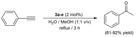 Markovnikov hydration of phenylacetylene catalyzed by complexes 3a-e.