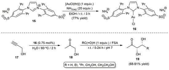 Very recently, Guérard-Hélaine and co-workers developed an efficient chemoenzymatic approach for the production of monosaccharides 19 using propargyl alcohol 17 and different aldehydes as the starting materials (Scheme 5) by combining the ammonium salt of the sulfonated NHC-Au(I) derivative 14, i.e., complex 16, with the aldolase FSA (fructose-6-phosphate aldolase) [57]. Complex 16, generated by reacting the zwitterionic imidazolium salt 15 with [AuCl(tht)] and aqueous ammonia, catalyzed the initial hydration of propargyl alcohol 17 into hydroxyacetone 18 in pure water at 60 °C. After the hydration step was finished, the pH of the solution was adjusted to 7, and the corresponding aldehyde and the enzyme FSA were added to the medium, leading to the aldol adducts 19 in good yields, and with complete stereoselectivity, after 5–24 h of stirring at room temperature.