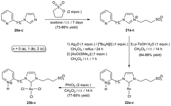 The application of sulfonated NHC-gold complexes in other catalytic transformations in aqueous environments has also been described. A relevant example is the cycloisomerization of γ-alkynoic acids. This type of reaction represents an easy and atom-economical methodology to produce unsaturated lactones [58,59], for which gold-based systems are among the most effective catalysts currently known [60]. Works by Michelet, Conejero, Cadierno and co-workers demonstrated the utility of water-soluble Au(I) and Au(III) complexes containing NHC ligands decorated with 3-sulfonatopropyl and protonated 2-pyridyl, 2-pycolyl or 2-pyridylethyl groups, i.e., compounds 22a-c and 23b-c in Scheme 6, in these cyclization processes [61,62]. Their synthesis involved the initial generation of the zwitterionic imidazolium salts 21a-c by reaction of imidazoles 20a-c with 1,3-propane sultone. Subsequent silver-mediated carbene transfer to [AuCl(SMe2)] in dichloromethane solution, followed by protonation of the pyridyl units with p-toluene sulfonic acid, led to the Au(I) derivatives 22a-c, which readily precipitated in the medium thus facilitating their isolation and purification. Oxidation of 22b-c with iodobenzene dichloride cleanly afforded the respective gold(III) complexes 23b-c.