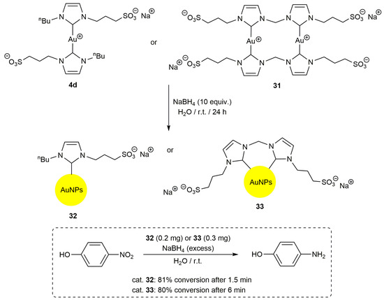 On the other hand, despite the growing interest in water-soluble NHC-stabilized Au NPs [64], examples involving sulfonated NHCs are still scarce [65,66,67], and only in one work, they were applied in aqueous-phase catalysis [67]. Thus, Dimitratos, Casini and co-workers reported the preparation of the gold NPs 32 and 33, stabilized by mono- and bidentate sulfonated NHCs, respectively, by direct reduction of the corresponding Au(I) bis-carbene derivatives 4d and 31 with sodium borohydride (Scheme 8). Complexes 4d and 31 were accessed from the corresponding imidazolium salts via silver-mediated carbene transfer to the Au(I) precursor [AuCl(SMe2)]. As shown in Scheme 8, NPs 32 and 33 were capable of promoting the reduction of 4-nitrophenol into 4-aminophenol in pure water employing excess NaBH4 as the reductant, with 32 being more active than 33 due to the higher accessibility to the Au sites associated with the lower NHC-surface coverage in the former. These Au NPs were also catalytically active in the reduction of 2-nitrophenol, 3-nitrophenol and resazurin, but conversions were lower compared to 4-nitrophenol. We should finally mention that the stabilization of gold NPs by sulfonated imidazolium salts has been additionally reported [68,69,70,71], with some of the resulting systems also showing catalytic potential for the reduction of nitroaromatic compounds in water [69,70].