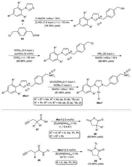 Belger and Krause additionally reported the synthesis of the related water-soluble Au(I) derivatives 46a-f, featuring, in this case, unsymmetrically substituted ammonium salt-tagged NHC ligands (Scheme 10) [74]. The precursor imidazolium salts 45a-f were accessed from the corresponding N-arylimidazoles 43 and the benzyl chloride derivative 44 following a reaction sequence similar to that commented above for the preparation of compounds 38a-b. Complexes 46a-f catalyzed the selective 5-exo-dig cyclization of the terminal γ-alkynoic acids 47 and amides 49 into the respective enol-lactones 48 and lactams 50 (Scheme 10). These cycloisomerizations reactions proceeded cleanly, under mild conditions, and in high yields when an aqueous triethylammonium buffer solution was employed as the reaction medium, with the use of pure water leading in general to compounds 48 and 50 in lower yields due to the partial decomposition of the gold complexes in the acidic medium generated by the substrates. As in the precedent case, no silver(I) co-catalysts were needed, and complexes 46a-f could be reused up to five times after extraction of the products from the aqueous solution with diethyl ether.