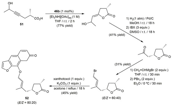 In the same work, the authors also developed a synthetic route for the furanocoumarin-functionalized lactone 52, an epimer of the natural product clausemarine A, in which the key lactone ring was assembled by cycloisomerization of the internal γ-alkynoic acid 51. As shown in Scheme 11, the cyclization process proceeded in high yield employing 1 mol% of complex 46b in the aqueous triethylammonium buffer solution (containing now a small amount of THF as co-solvent to facilitate the solubility of the substrate).