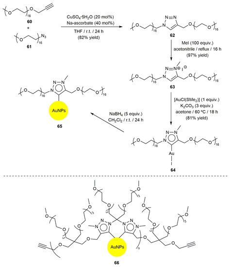 In line with the work just commented, it is worth mentioning that water-soluble gold nanoparticles and nanoclusters stabilized by PEGylated N-heterocyclic carbenes have gained attention in recent years for biomedical and biological applications [80,81,82,83]. However, the use of such nanomaterials in catalysis remains virtually unexplored. In fact, only a recent work published by Nazemi and co-workers can be currently found in the literature [84]. Thus, they reported the preparation of the robust water-soluble gold NPs 65 and 66, stabilized by mesoionic NHC ligands, capable of catalyzing the reduction of 4-nitrophenol into 4-aminophenol by NaBH4 in an aqueous solution [84]. The synthetic route employed for the preparation of 65 is detailed in Scheme 14.