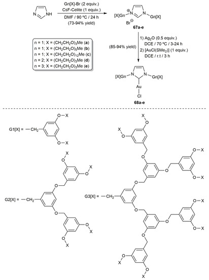 On the other hand, besides complex 59, mentioned above, other Au(I) derivatives with PEGylated NHC ligands have been applied in aqueous catalysis. For example, Fujita and co-workers described the preparation of a series of dendritic NHC-gold(I) complexes 68a-e having a poly(benzyl ether) dendron decorated on the periphery with ethylene glycol units [86,87]. As shown in Scheme 15, they were obtained in high yield from the corresponding imidazolium salts 67a-e using the silver oxide transmetallation route.