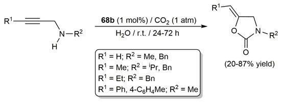 All these hydrophilic complexes proved to be catalytically active in the carboxylative cyclization of propargylic amines under mild conditions (r.t.) and an atmospheric pressure of CO2, and more importantly, employing pure water as solvent [86,87]. Among them, the best performances were achieved with 68b, having penta(ethylene glycol) units, which allowed access to a variety of 2-oxazolidinones in moderate to high yields (see Scheme 16). In addition, the authors also demonstrated its reusability in the sequential carboxylative cyclization by the successive addition of the propargyl amine substrate to the reaction medium. Also of note is the fact that, due probably to steric reasons, the second- and third-generation dendrimers 68d and 68e led in general to lower yields when compared to the first-generation one 68a (all of them featuring tri(ethylene glycol) as the hydrophilic units).