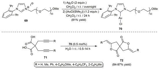 Che and co-workers reported the preparation of the PEGylated NHC-Au(I) derivative 70 from the imidazolium salt 69, generated by alkylation of 1-(2,6-diisopropylphenyl)imidazole with mesylated PEG (MeOPEG2000OMs), and [AuCl(SMe2)] through the silver oxide route [88]. Complex 70 proved to be an efficient and selective catalyst for the 5-exo-dig cyclization of γ-alkynoic acids, being able to operate in pure water, under mild conditions (r.t.), and in the absence of additives. A clear proof of its effectiveness and synthetic potential is the double cyclization of the dialkynoic acids 71 into the spiro enol-lactones 72, which were isolated in excellent yields (see Scheme 17). Remarkably, when the same double cyclization reactions were performed in dichloromethane with classical Au(I) catalysts, such as [AuCl(IPr)] or [AuCl(JohnPhos)], mixtures of regioisomers were obtained. Another important aspect is that, after extraction of the lactone product with diethyl ether, the aqueous solution containing 70 could be reused seven consecutive times while maintaining good catalytic behavior. However, we must note that slight losses of activity were observed after the second recycling cycle due to the generation of catalytically inactive Au NPs.