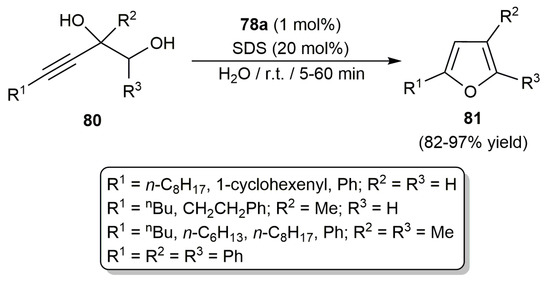 Complex 78a was successfully applied as a recyclable catalyst in the dehydrative cyclization of several alkynediols 80 to furans 81 in water, showing the best performances when the co-surfactant sodium dodecyl sulfate (SDS) was added to the reaction medium (Scheme 19) [89]. Although in less detail, the usefulness of 78a-b and 79 to promote the cyclization of γ-alkynoic acids and allenic alcohols was also demonstrated.