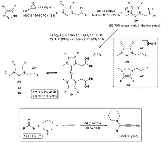 The inclusion of alcohol substituents in NHC ligands backbone can also be employed for the design of water-soluble transition-metal complexes [27,31]. In this context, Miriconda, Longo and co-workers have described several hydrophilic Au(I) and Ag(I) derivatives containing OH-functionalized NHCs with anticancer and antibacterial properties [90,91,92], some of them also showing catalytic potential. In particular, they found that the ionic bis-NHC gold(I) complexes 84, prepared from the imidazolium salts, 82 by transmetalation between the corresponding in-situ generated silver bis-carbenes, 83, and [AuCl(SMe2)] [90,91,92], are capable of promoting the synthesis of propargylamines by A3-coupling of aldehydes with piperidine and phenylacetylene (Scheme 20) [93]. Although the catalytic reactions were routinely performed under solvent-free conditions, it should be noted the successful use of formaldehyde in an aqueous solution.