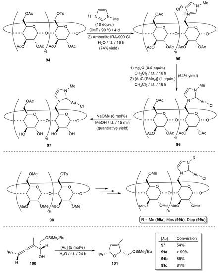 Cyclodextrin-based metal catalysts have attracted considerable attention in the last few years, and plentiful applications can be found in the literature [101]. In the context of the present review, Krause and co-workers demonstrated the utility of water-soluble β-cyclodextrin (β-CD)-tagged NHC-gold(I) derivatives in aqueous catalysis [102]. In the first approach, they synthesized complex 97 through the initial alkylation of N-methylimidazole with the tosyl-substituted peracetylated β-CD 94, followed by TsO-/Cl- anion exchange with the Amberlite IRA-900 Cl resin to afford the imidazolium chloride 95, the subsequent generation of the NHC-gold(I) complex 96 via the corresponding Ag-NHC intermediate, and final liberation of the secondary hydroxy groups of 96 by removal of the acetyl protecting groups with a diluted NaOMe solution in methanol (Scheme 21). Starting from the tosyl-substituted permethylated β-CD 98, the related gold complexes 99a-c were also obtained using the same alkylation/Ag-assisted coordination sequence.