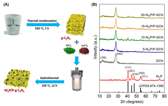 The Ni2P-modified P-doped g-C3N4 nanosheets were synthesized via a facile two-step synthetic procedure, as described in Figure 1A. Namely, we used a conventional thermal polycondensation reaction of urea to prepare g-C3N4 (denoted as GCN_b). Next, the growth of Ni2P nanoparticles on g-C3N4 and chemical doping of the host polymer with phosphorus atoms was achieved by reacting the as-made g-C3N4 with NiCl2 and red P precursors under hydrothermal conditions, so that 2D/3D hybrid hetero-nanostructures of tightly connected P-doped g-C3N4 nanosheets and Ni2P nanoparticles were obtained. In this hydrothermal process, P reacts with Ni2+ ions on the surface of g-C3N4 to give Ni2P nanoparticles, while also substitutionally doping the g-C3N4 crystal lattice. By regulating the concentrations of NiCl2 and red P in the reaction mixture, a series of Ni2P/P-g-C3N4 heterostructures (denoted as x-Ni2P/P-GCN) were produced with different weight contents of Ni2P, i.e., x = 5, 10, 15 and 20 wt.%. For comparison reasons, pure Ni2P and undoped (denoted as GCN) and P-doped (denoted as P-GCN) g-C3N4 nanosheets were also prepared using a similar hydrothermal process and thoroughly studied.