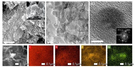 (A) FE-SEM images (Inset: high-magnification SEM image), (B) TEM image, (C) HRTEM (Inset: FFT pattern indexed to hexagonal P-62m Ni2P along the [100] zone axis) and (D) EDS elemental mapping images for 15-Ni2P/P-GCN catalyst.