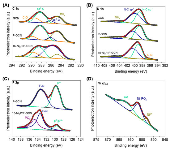 The valence state of elements in the as-prepared materials was analyzed by X-ray photoelectron spectroscopy (XPS). Figure 3A shows the C 1s spectra for GCN, P-GCN and 15-Ni2P/P-GCN, which is the most active catalyst in this series. For the GCN, deconvolution of the C 1s signal yields four singlet peaks at 284.8, 286.2, 288.3, 289.5 ± 0.2 eV binding energy due to the adventitious carbon, sp2-bonded (N–C=N) and sp3-bonded (C–N) carbons in triazine units, and surface COx impurities of g-C3N4, respectively [37,38]. Similar to this, the C 1s peaks associated with the N–C=N and C–N linkages and COx impurities of P-GCN appear at 286.2, 288.3 and 289.9 ± 0.2 eV and those peaks for 15-Ni2P/P-GCN appear at 285.9, 288.5 and 289.8 ± 0.2 eV, respectively. The weak C 1s signal at higher binding energy indicates minor surface oxidation, possibly due to the synthesis procedure and air exposure of the samples. In the deconvoluted N 1s spectra (Figure 3B), the prominent peaks at 398.8 and 400.0 ± 0.2 eV and the broad feature at 404.6 ± 0.2 eV for GCN (398.8, 400.5 and 404.1 ± 0.2 eV for P-GCN) are assigned to the sp2-bonded (pyridinic N) and sp3-bonded (pyrrolic N) nitrogen and terminal-NHx species of g-C3N4, respectively [39]. For the 15-Ni2P/P-GCN catalyst, the N 1s XPS spectrum indicates similar chemical states at 399.1 and 400.6 and 404.7 ± 0.2 eV, while the newly appeared photoelectron peak at 396.8 ± 0.2 eV can be attributed to the metal (Ni) −N bond [40], indicating tight interfacial adhesion by covalent bonding between Ni2P particles and the host polymer matrix. Figure 3C displays P 2p XPS spectra for P-GCN and 15-Ni2P/P-GCN. The P 2p signal of P-GCN manifests as two singlet peaks at 129.8 and 133.2 ± 0.3 eV, in agreement with the literature data for P–P and P–N bonds, respectively [41]. This confirms the incorporation of P atoms into the g-C3N4 lattice during the hydrothermal synthesis, although a small amount of unreactive phosphorus is situated on the surface of the sample. In line with this, the P-GCN possesses a lower C/N atomic ratio than the pristine GCN, that is 0.72 versus 0.73, implying a carbon-deficient g-C3N4 structure, in which we assume C atoms are replaced by P atoms. The deviation of the C/N ratio from the ideal value (C:N = 0.75) for the GCN is likely due to the fracture of some C–N bonds in the triazine rings and, thus, the fragmentation of the g-C3N4 flakes during the hydrothermal process, in accordance with the TEM observations. Similar multiple valence states of P were also observed in the Ni2P-modified sample. Specifically, the P 2p signal of 15-Ni2P/P-GCN consists of three singlet peaks at 129.6, 133.5 and 134.7 ± 0.3 eV, which are assigned to the P–P and/or Ni–P coordination bonds as well as the P–N linkages and POx impurities due to the inadequate surface oxidation of P-doped GCN, respectively [42,43,44,45]. According to the XPS results, the P-doping content in the implanted samples is roughly 0.3 at.%. As for the Ni 2p3/2 spectrum of 15-Ni2P/P-GCN (Figure 3D), the photoelectron peak at 853.0 ± 0.2 eV points to the formation of the Ni–P coordination bonds, while the peak at 856.7 ± 0.2 eV together with the satellite signal at 862.0 ± 0.2 eV imply the presence of the paramagnetic Ni(II) ions owing to the partially oxidized Ni–POx/OH species [40,45,46,47]. Taking together, the results from the above studies unambiguously manifest the successful growth of Ni2P nanoparticles and simultaneously doping of g-C3N4 lattice with phosphorus, highlighting the present synthetic method toward the fabrication of Ni2P/P-doped g-C3N4 hetero-nanostructures with strong interfacial adhesion.