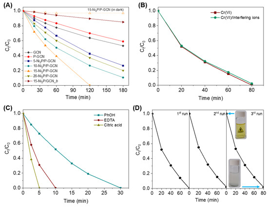 Photocatalytic reduction of aqueous Cr(VI) solution over (A) different catalysts (The time evolution of the Cr(VI) reduction over the 15-Ni2P/P-GCN catalyst in the dark is also given), (B) 15-Ni2P/P-GCN without and with the presence of various interfering ions (SO42−, CO32−, NO3−, Cl−, Na+, Cu2+, Mn2+ and Zn2+) and (C) 15-Ni2P/P-GCN in the presence of three equivalents of phenol (PhOH), ethylenediaminetetraacetic acid (EDTA) and citric acid. (D) Recycling study of 15-Ni2P/P-GCN catalyst in the photocatalytic reduction of Cr(VI). All the photocatalytic experiments were performed as follows: 0.8 g·L−1 (or 0.4 g·L−1 for catalytic tests in panel A) catalyst, 50 mg·L−1 Cr(VI) solution, pH = 2, λ > 360 nm light irradiation, 20 °C.