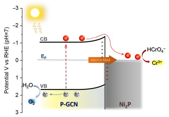 On the basis of the above results, we suggest a possible reaction scheme for the photocatalytic conversion of Cr(VI) by the Ni2P/P-GCN catalysts. As illustrated in Scheme 1, under light illumination, the photogenerated electrons at the CB of g-C3N4 will transfer to Ni2P due to the intrinsic electric field formed at the Schottky Ni2P/P-g-C3N4 junctions, where they efficiently convert Cr(VI) ions (mainly in HCrO4− form) to Cr(III). Evidence for such charge transfer pathways is obtained from the EIS and TR-PL studies. In parallel, the photogenerated holes on the surface of g-C3N4 can oxidize the water to generate oxygen during the photocatalytic process. The energy band diagrams in Figure 5B show that the VB levels of Ni2P/P-GCN catalysts are located below the potential of water oxidation (0.82 V at pH 7), thus demonstrating the capability of these materials for photocatalytic water splitting and oxygen evolution reaction.
