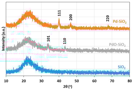 The crystallinity of the prepared and as-synthetized samples was compared with that of the bare SiO2 by using the XRD technique. Figure 1 presents the XRD patterns of the three samples, the bare SiO2, the as-synthetized Pd-SiO2 (before reduction), and the final solid Pd-SiO2 samples. The bare SiO2 sample exhibited one broad peak centered at 2θ of 22.5° as an indication of the amorphous nature of the commercial SiO2 sample. After incorporating Pd and before reducing the sample, the peaks of PdO at 2θ values of 33.7° and 42.8°. These peaks are attributed to the planes of (101) and (110) of palladium oxide species according to JCPDS card no. 43-1024 [41]. Pd-SiO2 sample after reduction showed different peaks at 2θ values of 40.0°, 46.5°, and 67.9°, which can be referred to the planes of (111), (200), and (220) of Pd nanoparticles according to the JCPDS card no. 89-4897 [42]. The XRD data demonstrate that the reduction process completely reduced the PdO nanoparticles in the as-synthetized samples to Pd0 nanoparticles in the final solid product.