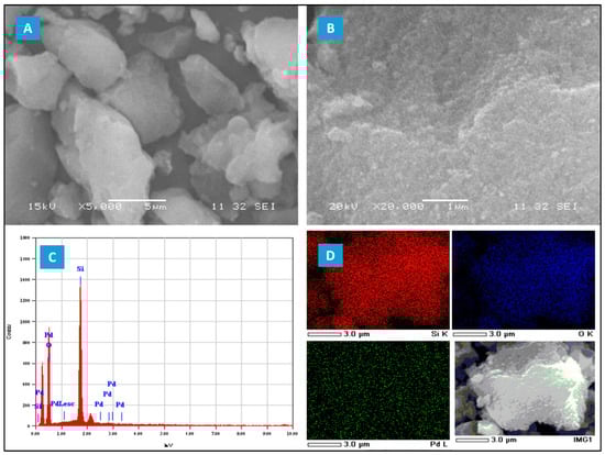 The morphological structure of the Pd-SiO2 sample was investigated by using scanning electron microscopy equipped with EDX analysis. The micrographs of the sample are presented in Figure 2A,B. The particles of Pd-SiO2 exhibited the irregular shape of bulky amorphous silica; moreover, the surface of the sample was clean, and no crystalline particles of Pd were observed as an indication of the total incorporation of Pd nanoparticles in the silica framework. The corresponding EDX analysis showed only the elements of Si, O, and Pd, which are present in the sample without any other elements as an indication of the purity of the sample (Figure 2C). Finally, the elemental mapping (Figure 2D) showed a well distribution for the Pd nanoparticles throughout the entire sample.