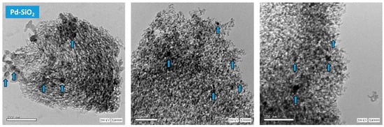Different TEM images for the Pd-SiO2 sample; arrows are pointing to the Pd nanoparticles.