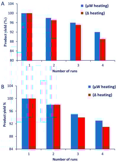 Reusability of Pd-SiO2 in the reduction reaction of (A) 4-nitrobenzylalcohol and (B) 4-nitrophenylhydrazine.
