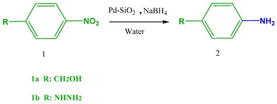 Nitroaromatic compounds are few among the most common organic pollutants and explosives, and, hence, their conversion to some value-added products is of great relevance and importance [44,45]. The catalytic efficiency of the Pd-SiO2 has been examined in order to get full conversions of nitroarenes to aromatic amines with high yields in aqueous media; also, the heating mode for the reaction is one of the most important parameters in this work. Pd-SiO2 was found to be an efficient catalyst for the reduction of nitroarenes with excellent yield using water as a solvent regardless of the nature of the substituent pendant on the aromatic ring.