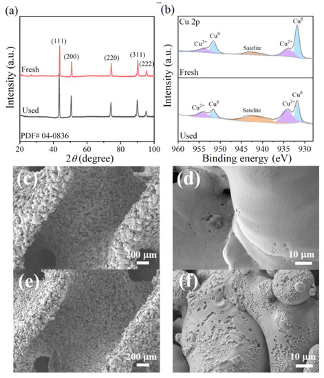 (a) XRD patterns of 3DHP-ZVC, (b) Cu 2p XPS spectra of 3DHP-ZVC before and after reactions, and SEM images of (c,d) 3DHP-ZVC, and (e,f) used 3DHP-ZVC.