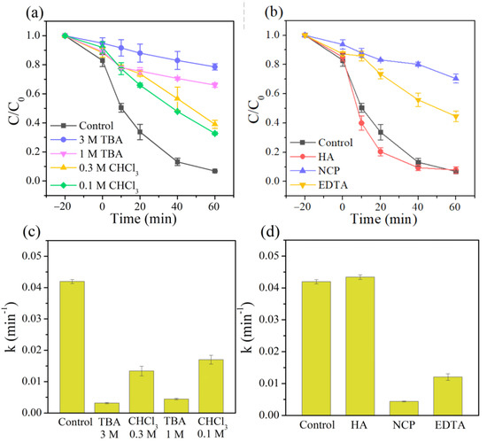 Effects of (a) different scavengers (TBA and CHCl3), (b) HA, NCP, and EDTA for TC removal in the 3DHP-ZVC/H2O2 system, and (c,d) their corresponding reaction rate constant under different conditions.