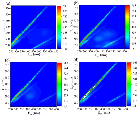 Three-dimensional EEM fluorescence spectra of TC solution after (a) 0 min, (b) 30 min, (c) 60 min, and (d) 24 h during the reaction.