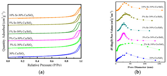 The BET analysis was conducted to get the N2 adsorption–desorption isotherms and the BJH (Barret–Joyner–Halenda) pore size distribution of these catalysts, as exhibited in Figure 1. The isotherms of all the catalysts have followed the IUPAC type IV isotherms pattern, where a hysteresis loop was formed from p/p° ≈ 0.6–1.0, indicating the existence of a typical H3 class mesoporous structure [7,44]. The surface area (BET), and mean pore diameter (BJH method) of the support and catalysts are tabulated in Table 1, which indicates that the BET surface significantly improved in the promoted catalyst, with 5% Sr-promoted catalyst showing the maximum surface area of 119.3 m2/g. It is also of substantial importance that the BJH-pore volume of promoted catalysts also increased, which is a reason for improved activity and stability. Although the addition of promotor enhances the copper dispersion and decreases the aggregation of copper species, which usually causes the obstruction of pores, we observed increased BET surface area, pore diameter, and pore volume in the case of 5%Sr-30%Cu/SiO2 catalyst, as explained in TEM and XPS analysis in Section 3.3 and Section 3.5, respectively. However, the results also indicated that when the loading of Sr was further increased, BET surface area and BJH-pore volume decreased, which also explains the reduced MA conversion and selectivity of ethanol due to the formation of agglomerates [28,39]. Figure 1 revealed that the pore size of promoted catalysts lies in the range of 10–60 nm in most of the promoted catalysts.