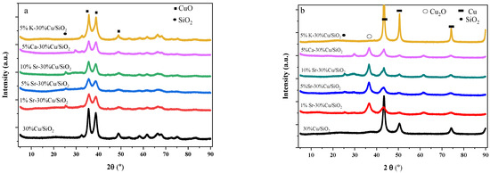 XRD patterns of (a) calcined and (b) reduced Cu/SiO2 and xM-30%Cu/SiO2 catalysts.