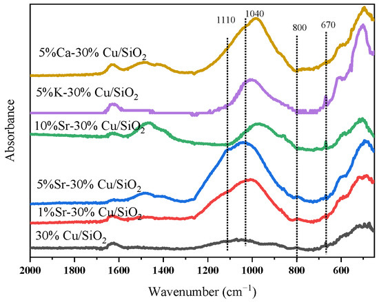 The absorption peaks of FTIR spectra shown in Figure 3 confirmed the presence of Cu phyllosilicate in promoted and non-promoted catalysts, and this fact could be supported by the appearance of the δOH band at 670 cm−1 and the υSiO shoulder peak at 1040 cm−1 [47]. The weak band observed at 670 cm−1 could be ascribed to δOH bond of Cu2SiO5(OH)2 [48]. All the promoted catalysts were initially dried and at that stage Cu2SiO5(OH)2 structure was formed, but during the calcination stage this structure vanishes, hence, very faint peaks were observed in FTIR. However, strong diffraction peaks related to CuO were observed at 35.5° and 38.7° in XRD patterns, due to which minor peaks related to Cu2SiO5(OH)2 might have covered, which also suggests its maximum decomposition after calcination [10]. Furthermore, the presence of band at 670 cm−1 related to copper phyllosilicate could be observed in all the promoted and nonpromoted catalysts, referring to the fact that this structure is largely preserved in all catalysts, however, its intensity varies in different catalysts, with 5%K-30%Cu/SiO2 showing the strongest intensity of the peak. The band observed at 490 cm−1 in all of the promoted and non-promoted catalysts may be due to CuO stretching vibrations [49,50]. Accordingly, the bands observed at 1110 cm−1, 800 cm−1, and 490 cm−1 could be attributed to the existence of SiO2 and copper oxides in the catalysts, which is also in agreement with XRD results.
